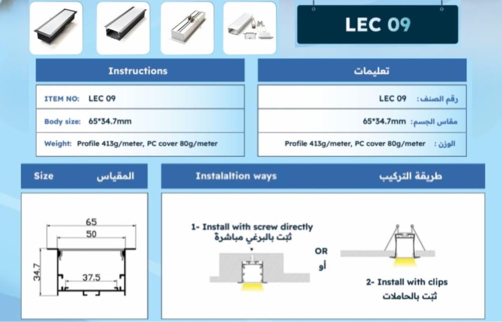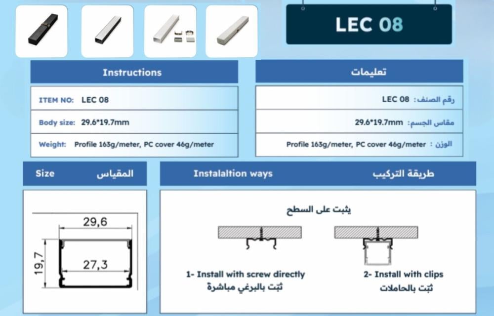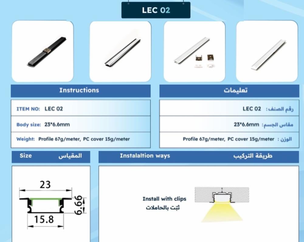 - حماية فائقة: يوفر بروفايل ليد LECLERC حماية ممتازة لشرائط الإضاءة LED من العوامل الخارجية مثل الغبار والرطوبة، مما يضمن عمرًا أطول للشرائط واستدامة عالية.