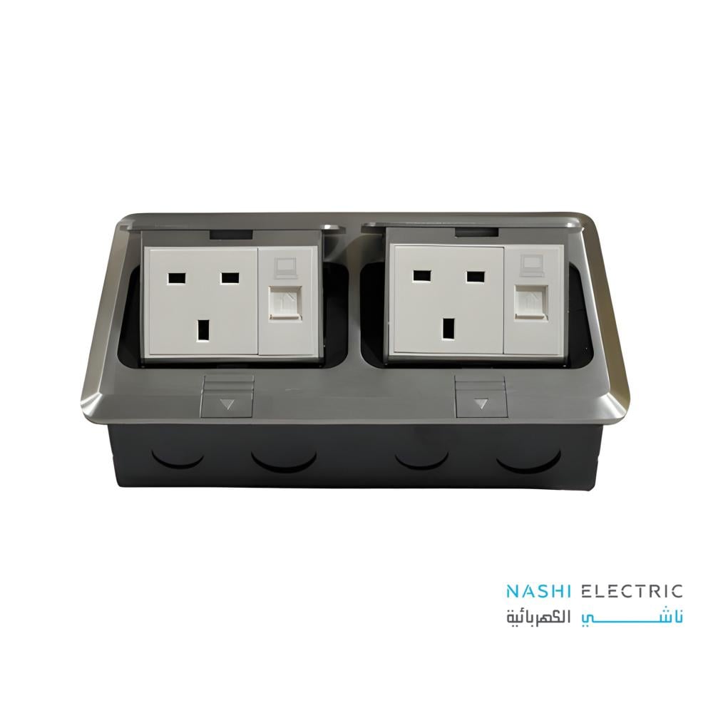 تحتوي العلبة على فيش 13A مجوز + 2 فيش كمبيوتر، مما يجعلها الخيار المثالي لتلبية احتياجاتك الكهربائية في المكتب أو المنزل. يمكن استخدامها بسهولة في تركيب الأرضيات أو الأسطح القابلة للطي، مما يوفر لك حلاً عمليًا ومرنًا.